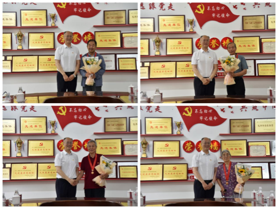 付强代表学校党委为出席仪式的8名党龄满50年的老党员颁发了“光荣在党50年”纪念章并赠送鲜花。